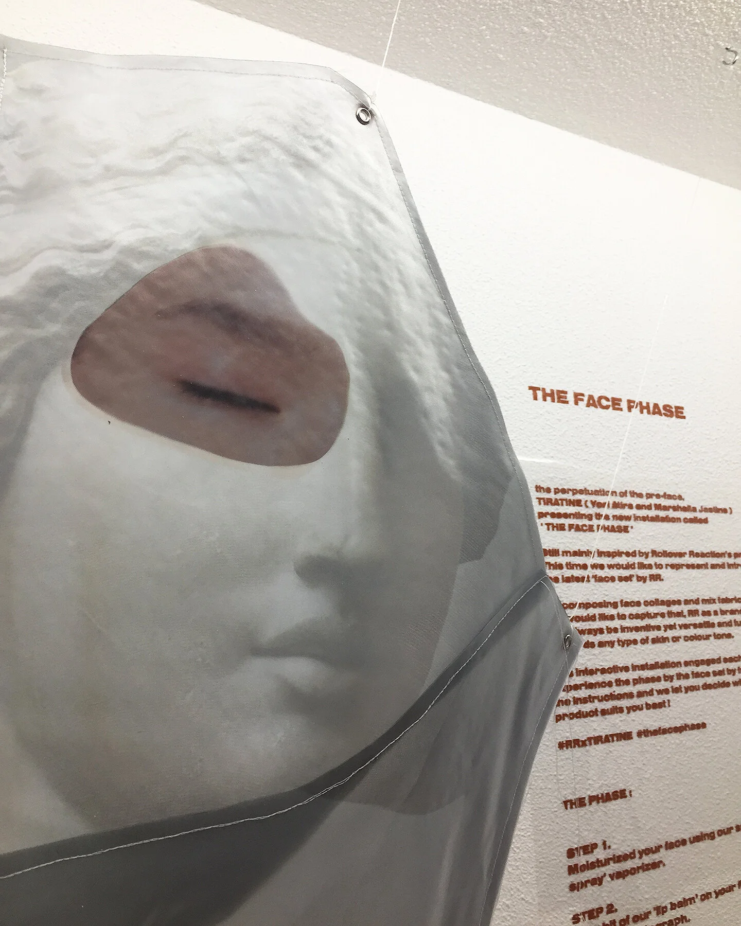 The second installation was an interpretation of their next launch, the Face Set. The Face mist, face wipe and lip balm are the essentials to take anywhere on the daily, to stay refreshed and hydrated. The installation took form of a collage of various types of textiles mixed with found beauty-related objects, a nod Rollover Reaction’s versatility in celebrating every different skin tone, skin types and each women’s uniqueness and individuality. The materials used ranged from mesh, digitally printed fabrics to PVC, creating different textures the viewers can touch, see and feel.