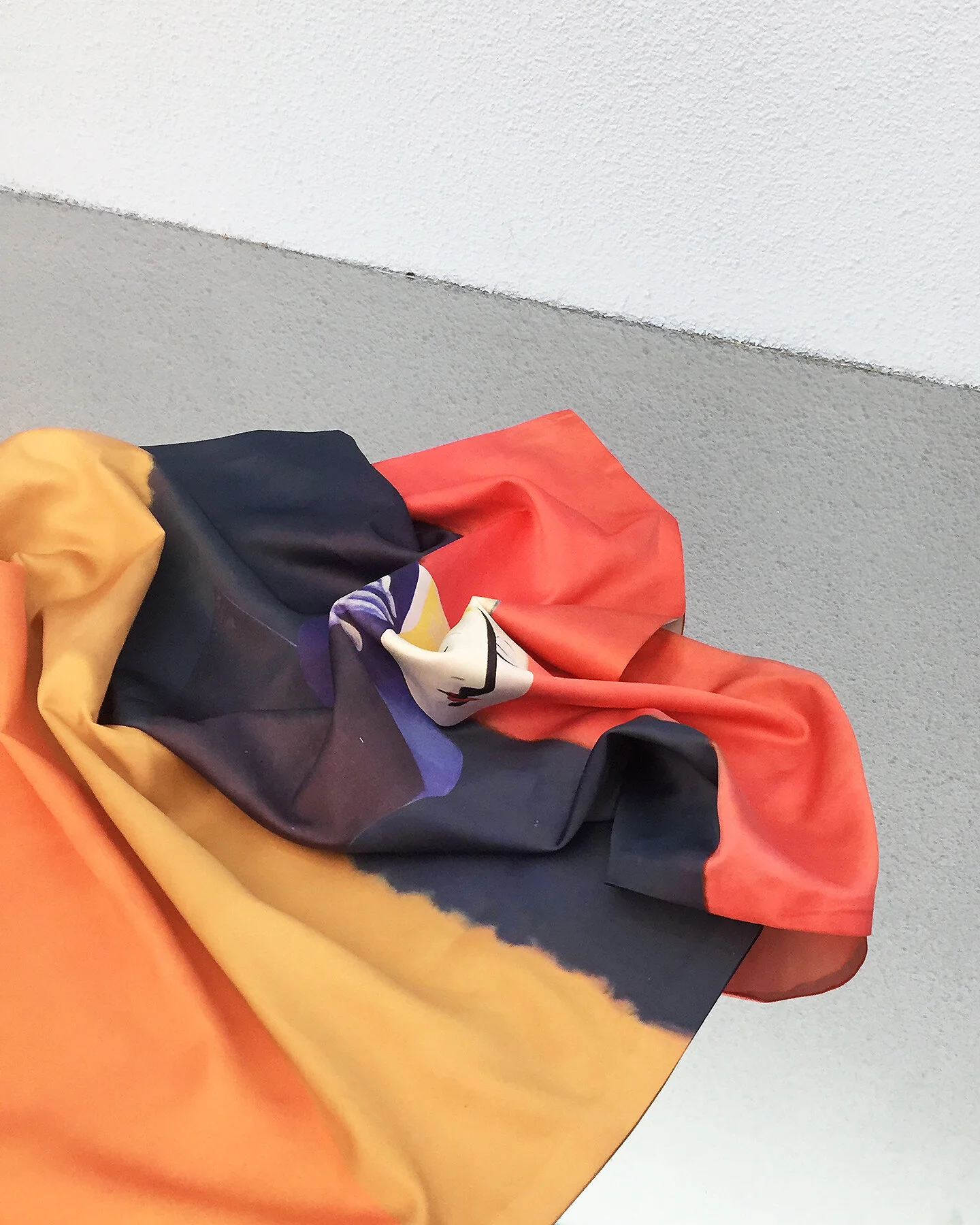 The installation features a framed collage of Picasso, Maccio and Rothko’s paintings, wrapped in digitally printed fabric of the collage, with assortments of glasses, papers, sponges, paint, brushes and crushed crayons of a vibrant palette laid out along with the products.